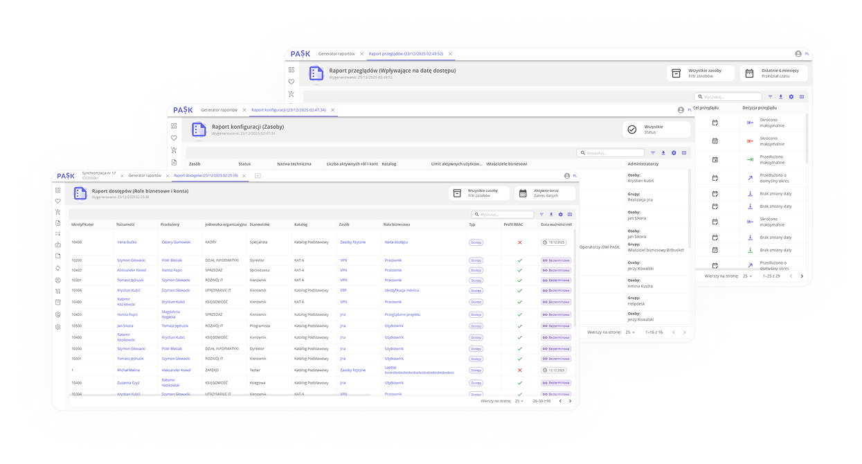 PASK zapewnia szczegółowy wgląd w zmiany, konfiguracje i historie działań podejmowanych na dostępach - wszystko z możliwością łatwego raportowania i analizy.