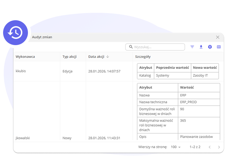 Przejrzysta ewidencja zmian w modelu ról, zasobów oraz definicjach wniosków.