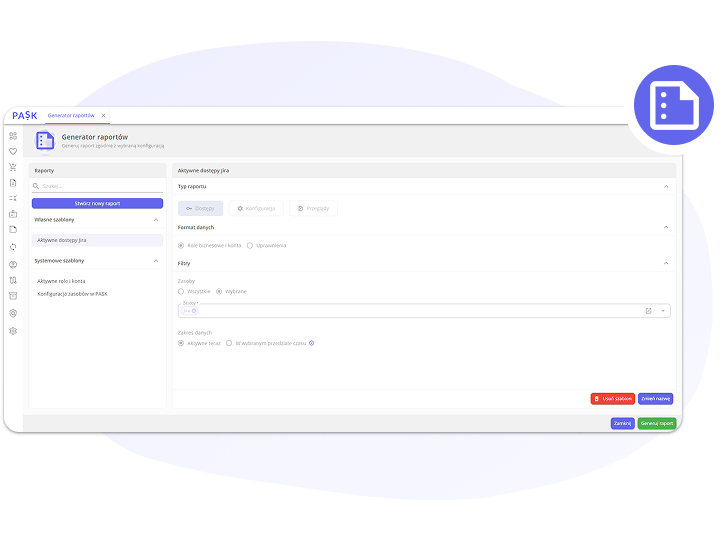 PASK zapewnia szczegółowy wgląd w zmiany, konfiguracje i historie działań podejmowanych na dostępach - wszystko z możliwością łatwego raportowania i analizy.
